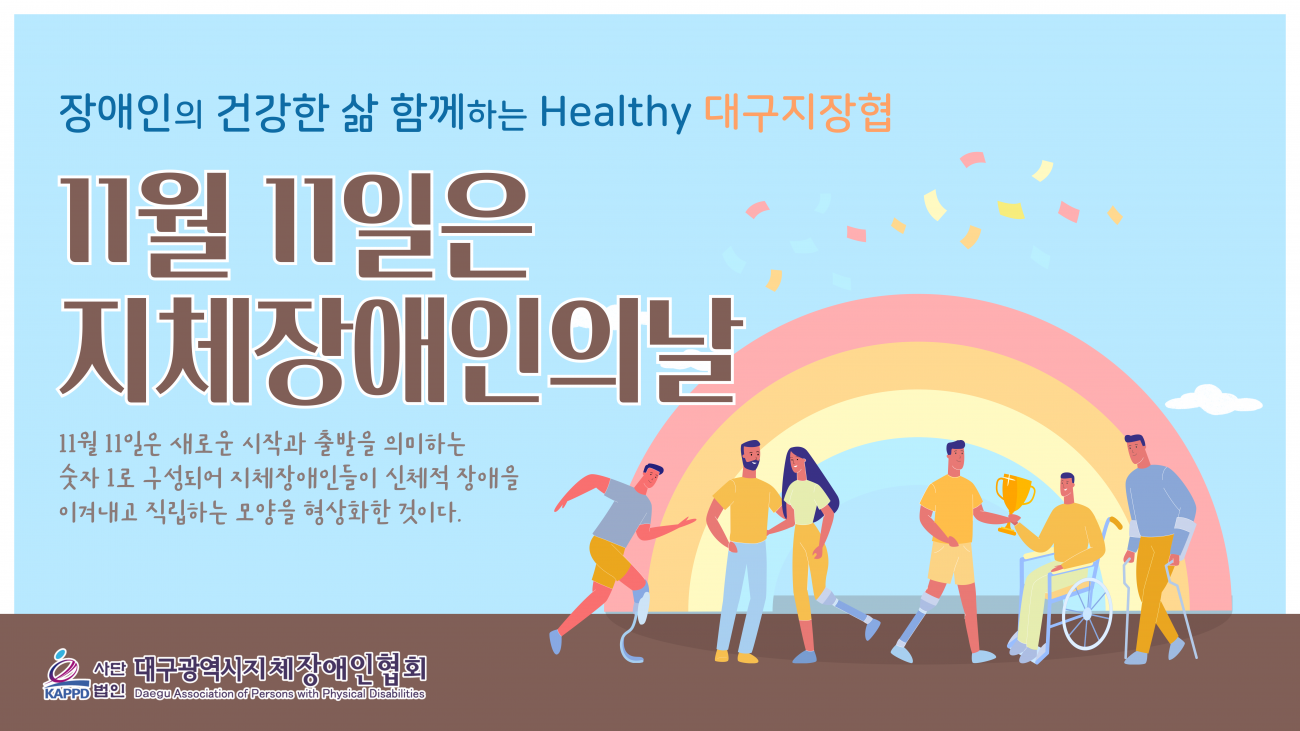 11월 11일은 지체장애인의 날! 최고관리자 0 2 5시간전 11월 11일은 지체장애인의 날!장애가 존중받는 세상, 모두가 건강하고 당당한 사회를 실현하도록.장애인의 건강한 삶 Healthy 동행장애인주간보호센터와 대구지체장애인협회가 함께합니다.
