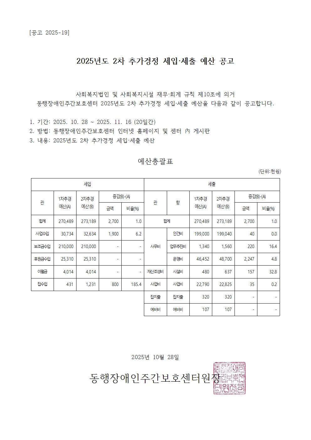 2025년도 2차 추가경정 세입·세출 예산 공고 최고관리자 0 3 10.28 15:03 사회복지법인 및 사회복지시설 재무·회계 규칙 제10조에 의거동행장애인주간보호센터 2025년도 2차 추가경정 세입·세출 예산을 다음과 같이 공고합니다.